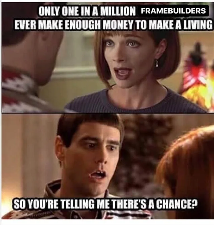 Being a frame builder is a terrible way to make a living. It requires a long list of skills and problem-solving intuition that if you were to apply it to any other trade/skill/job You would have a bett er chance at making a living at it. I mean “Frame builder” as the business owner and operator. You can work for someone making bikes but then your Job title would be a fabricator. You have to be a designer, fabricator, customer service person, bookkeeper, photographer, marketer, etc. Ideally, you want to focus on design and fabrication but until you make it you gotta do everything. Sure, there are software and apps that can help you do these jobs more efficiently but you still have to do everything. Hopefully, if you succeed, you’ll start hiring people to replace you in the tasks you don’t want to do. In the beginning, you are a terrible craftsman but with practice, you get better. You have to build up your reputation, build trust, create demand for your craft. It will take a long time to get there. You have to find something that will differentiate your work from everyone else's and be able to charge enough so you can keep doing it. Making it only means being able to make a sustainable living with your craft. You'll likely won't be able to become financially wealthy but you'll probably have a fulfilling life. And thats cool with me.
